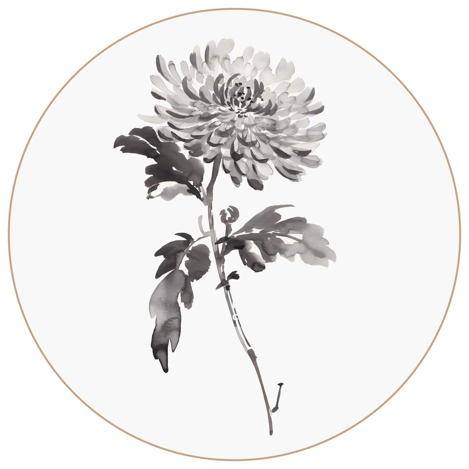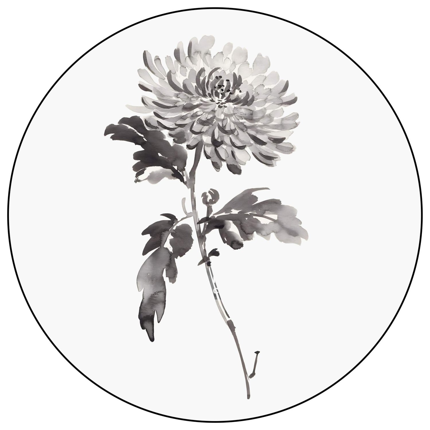 Quadro Decorativo Redondo Kiku Pintura de Flor Ornamental Crisântemo no Estilo Sumiê com Moldura em Couro Sintético