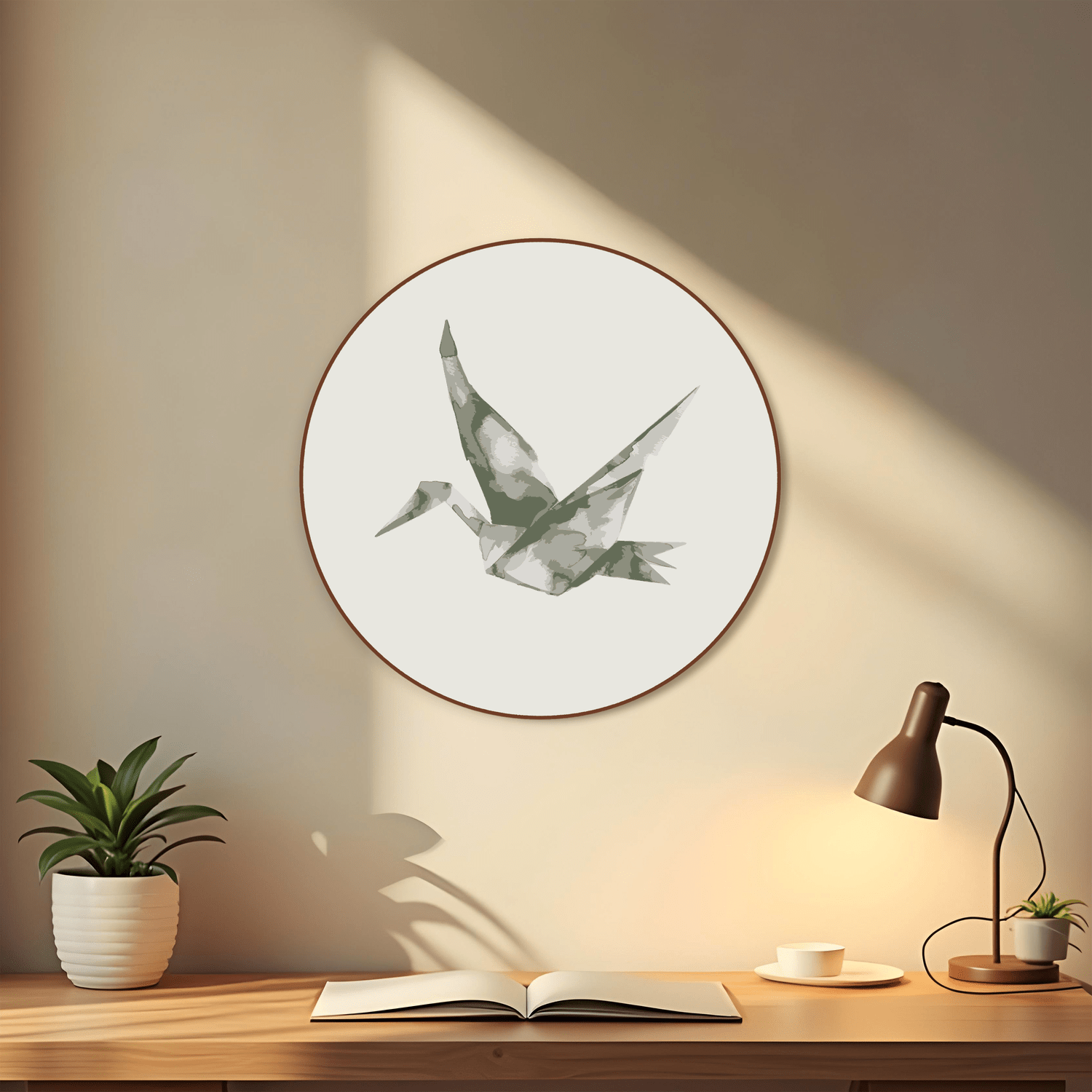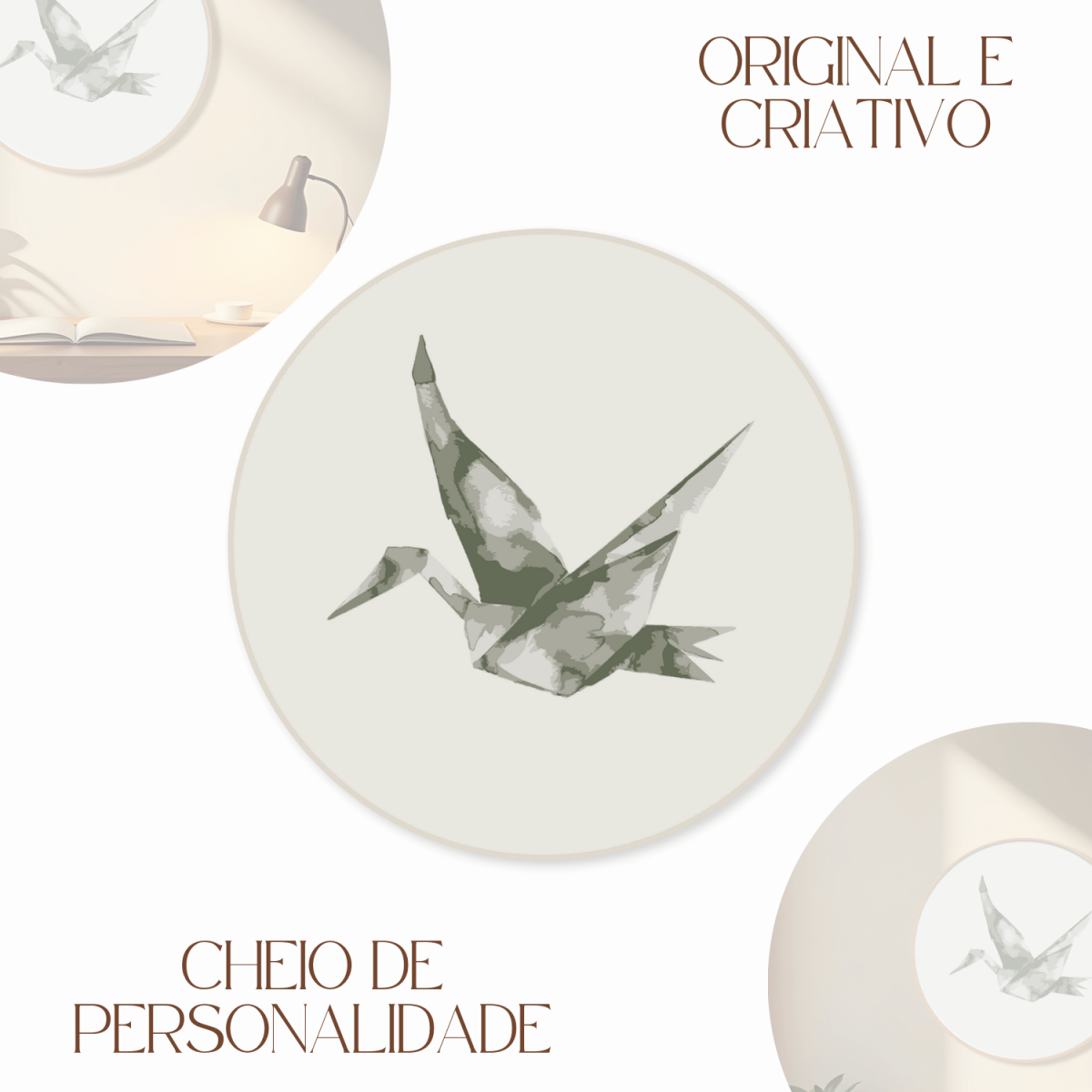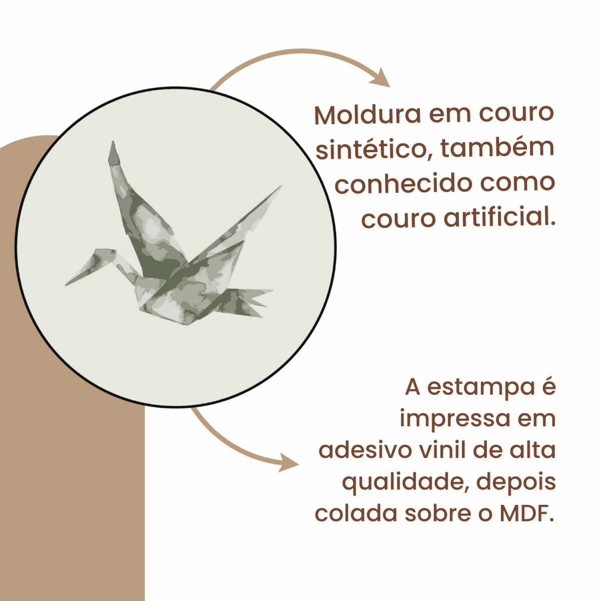 Quadro Decorativo Redondo Pássaro Tsuru Com Moldura Em Couro Sintético