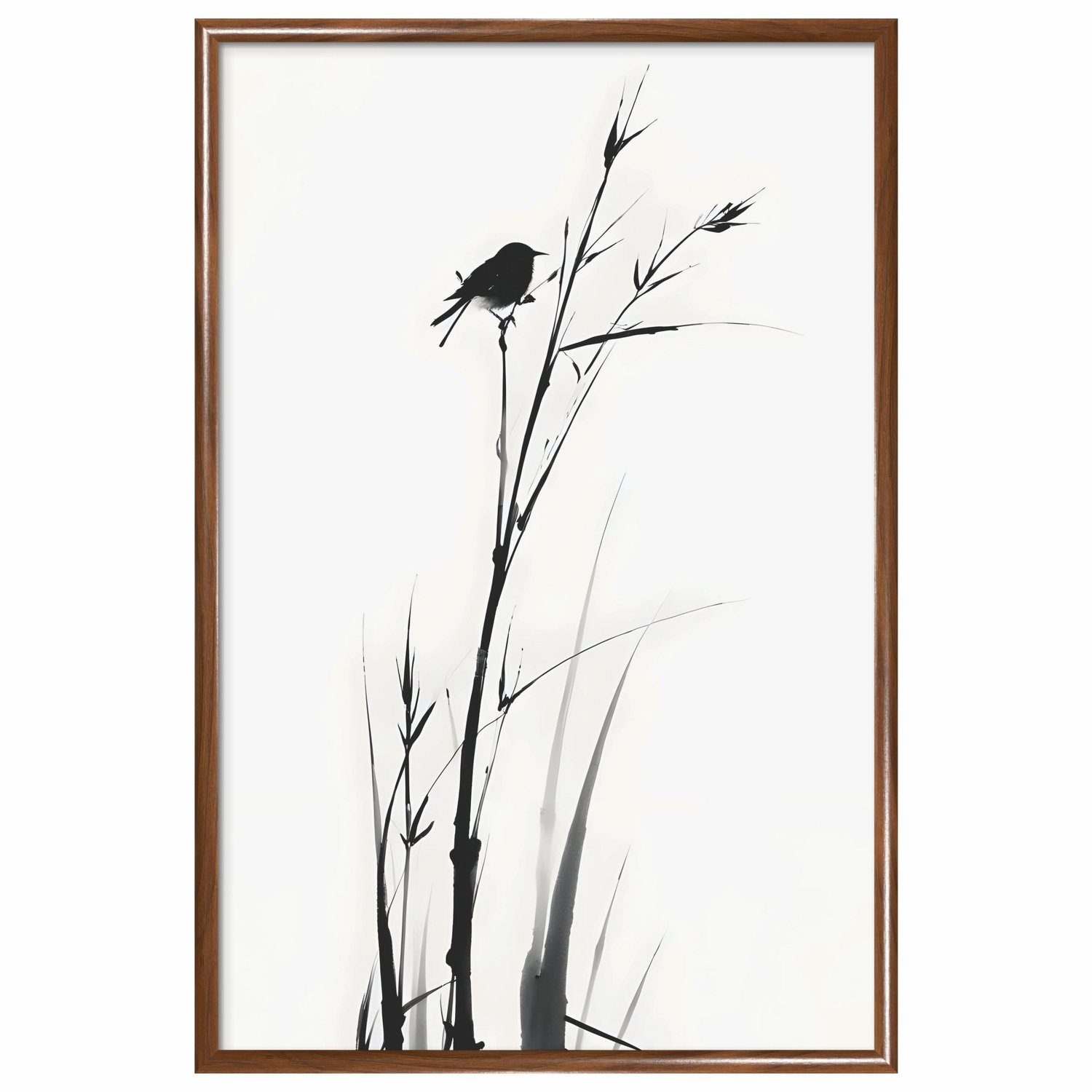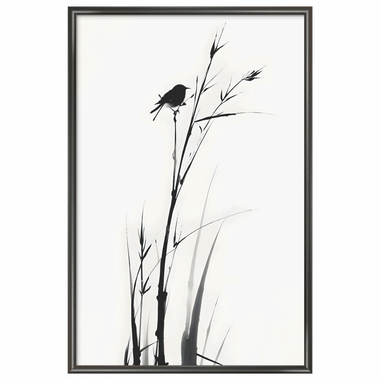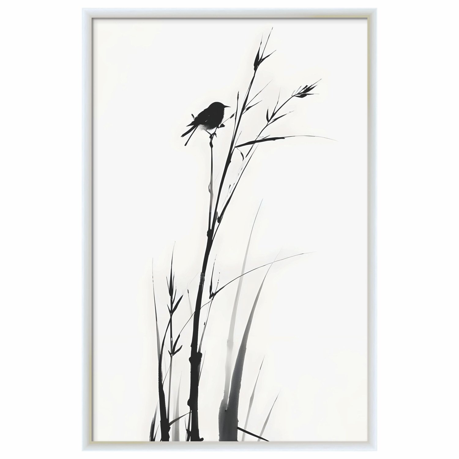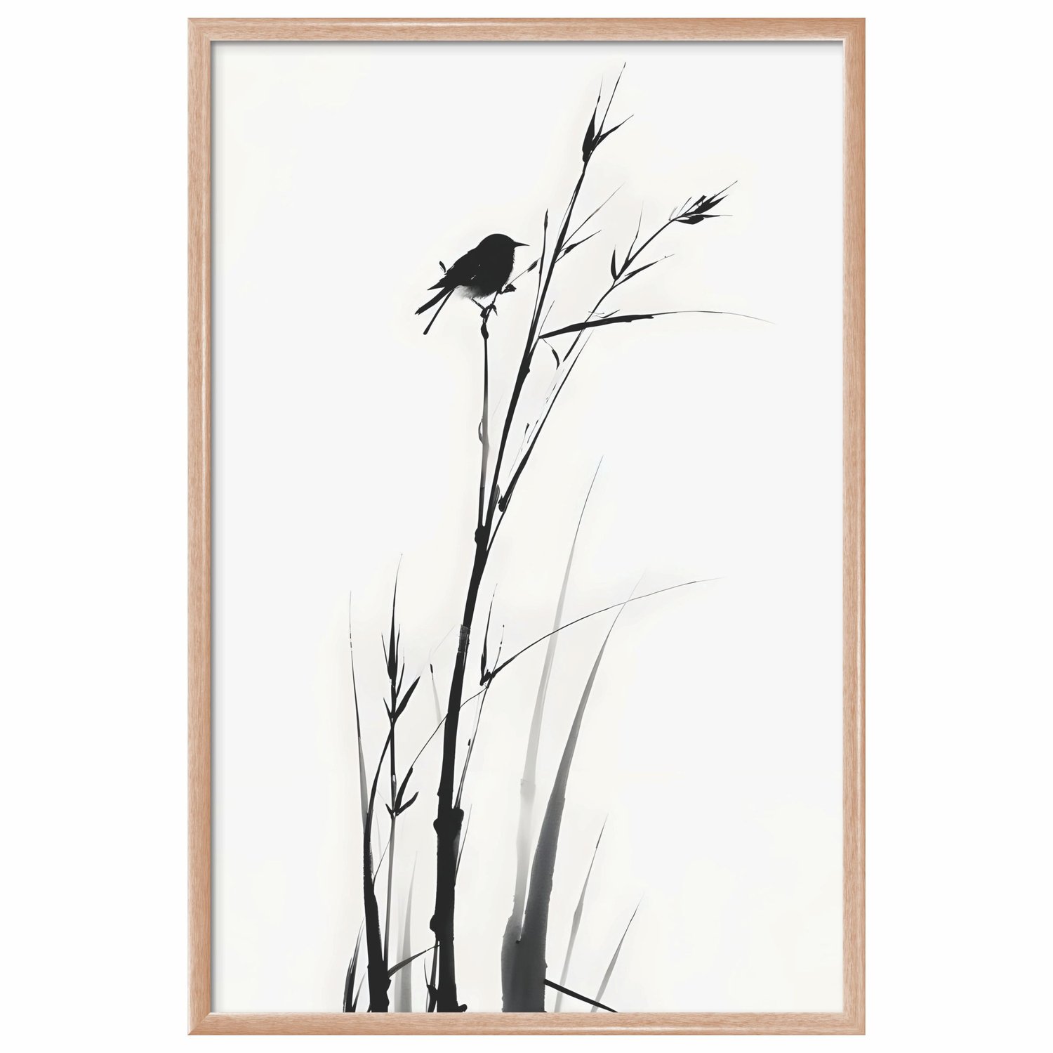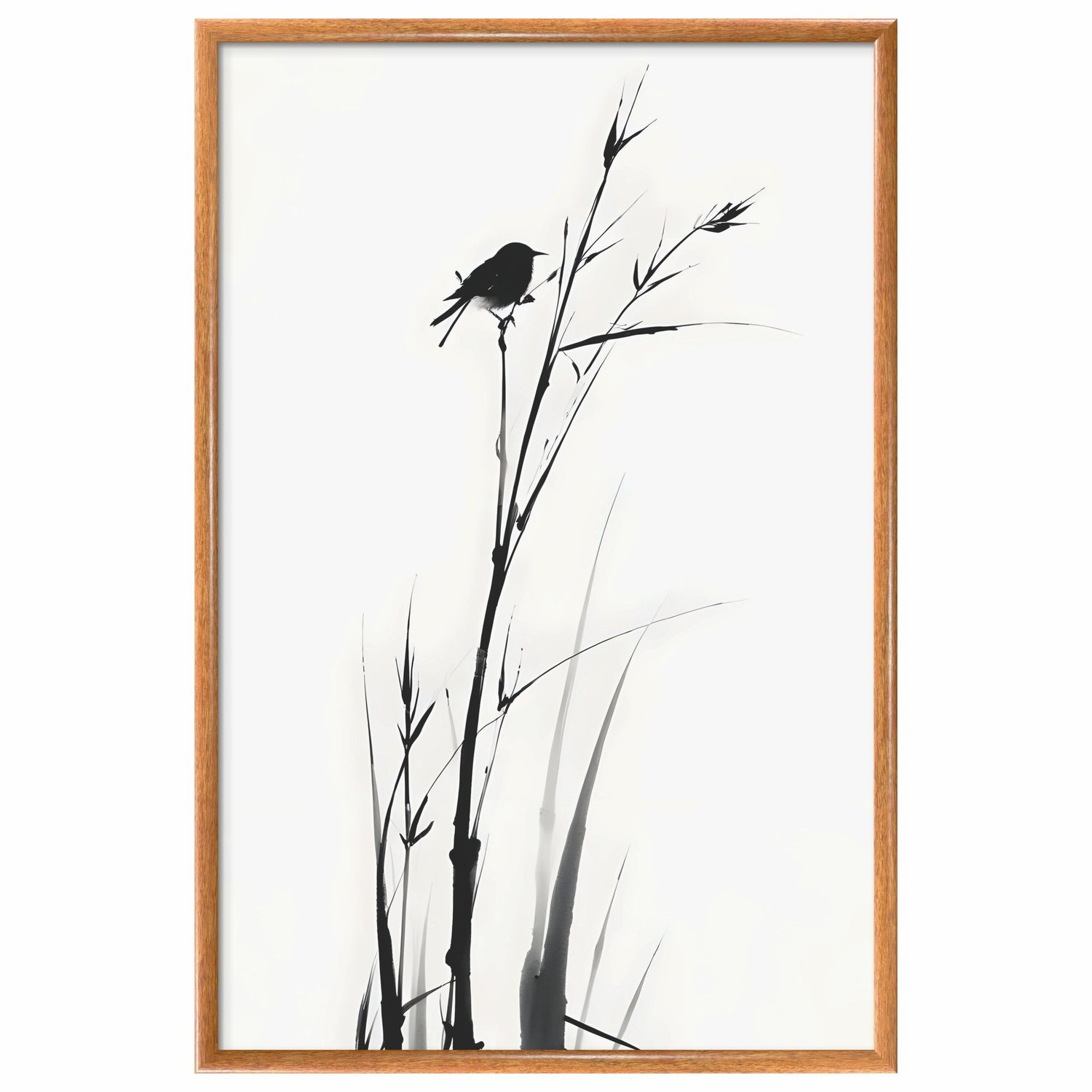 Quadro Decorativo Suzume Pintura de Pardal em Meio à Vegetação no Estilo Sumiê