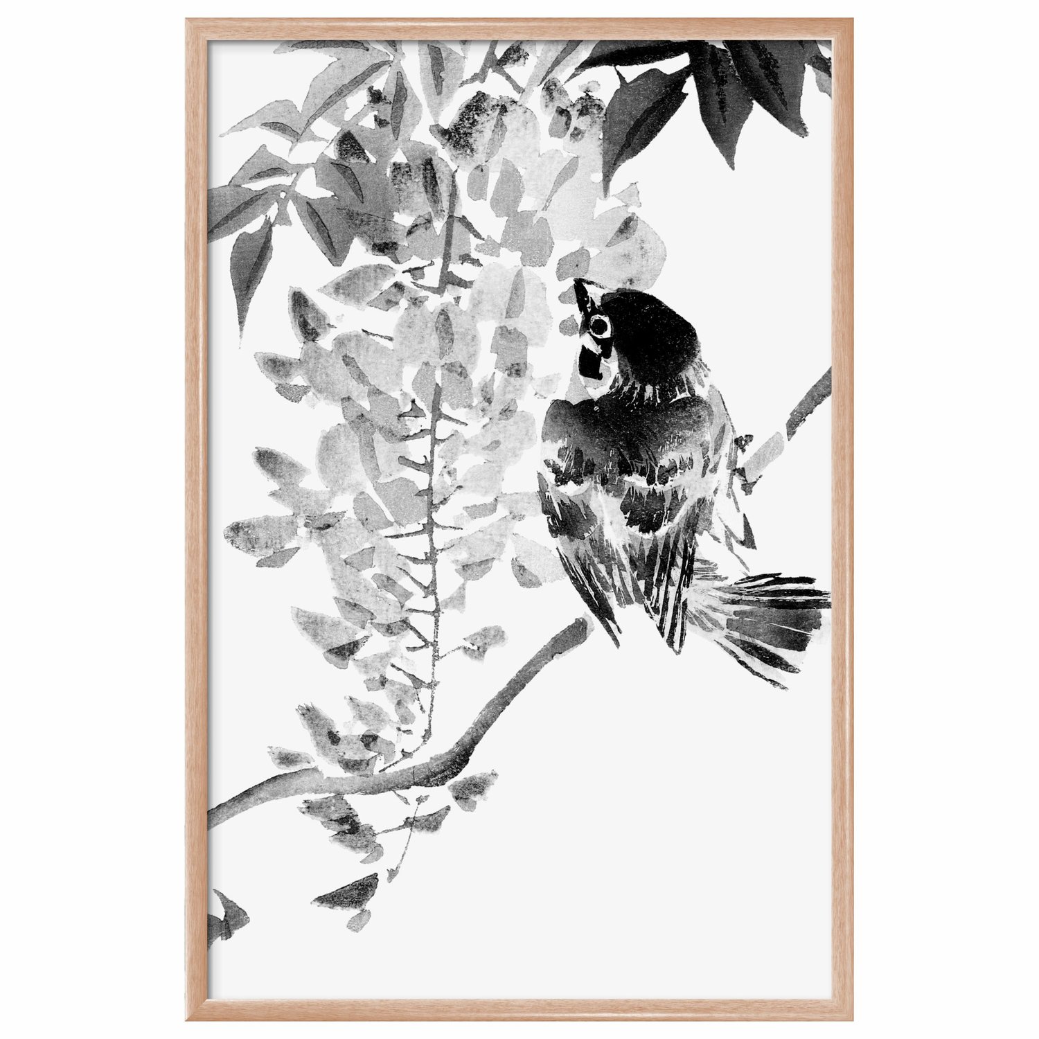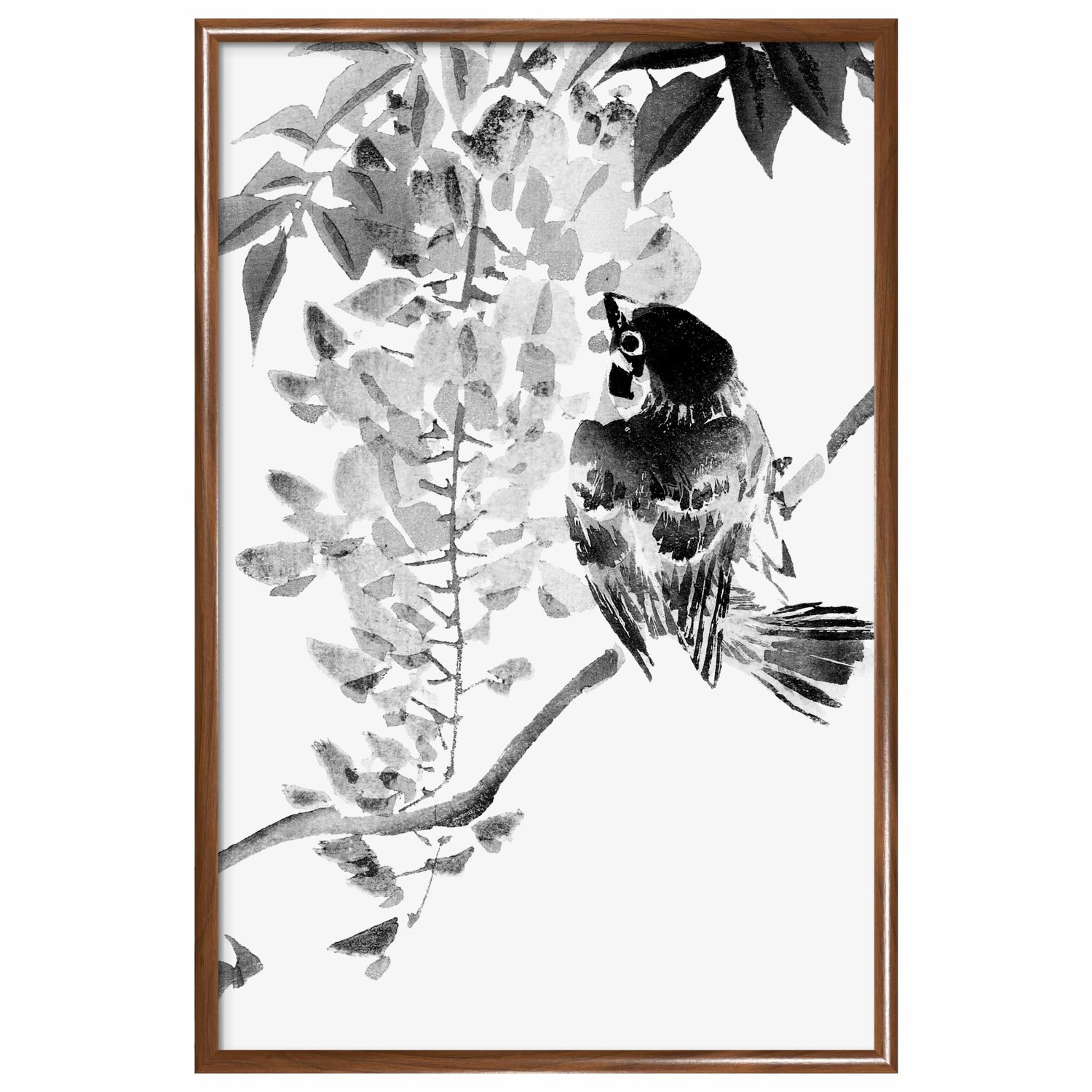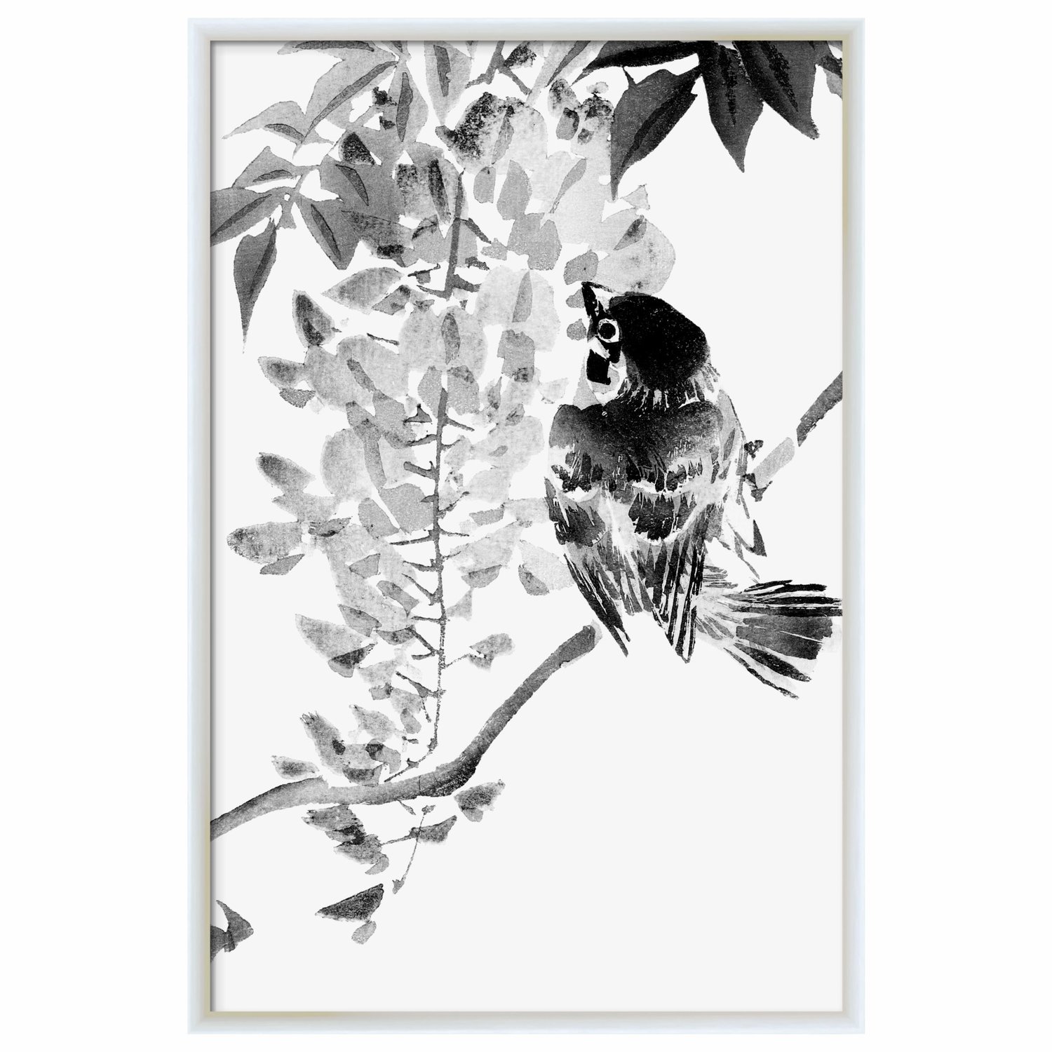 Quadro Decorativo Suzume Pintura de Pardal em Meio às Flores no Estilo Sumiê