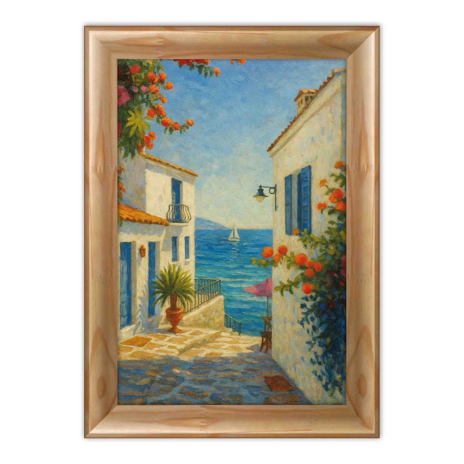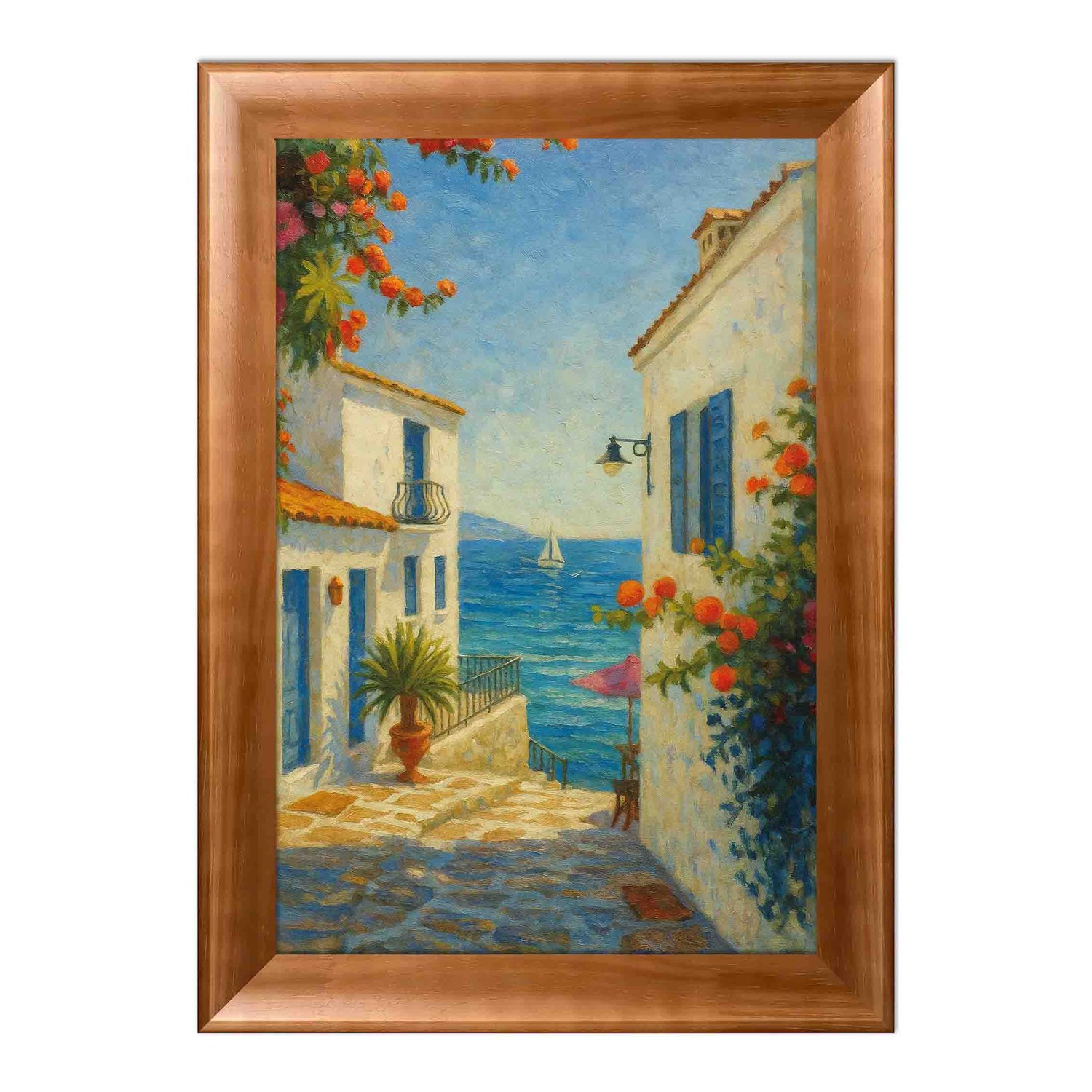 Quadro Decorativo Viela Grega ao Mar Azul: Buganvílias e Sol Mediterrâneo