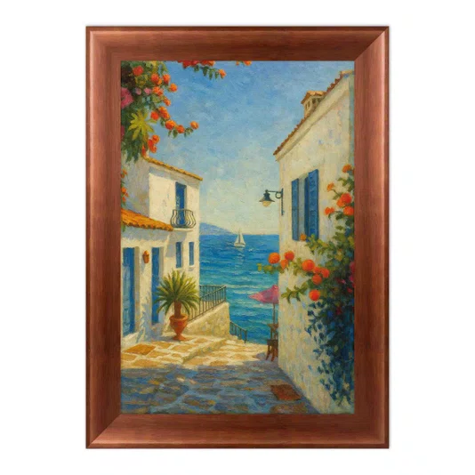 Deixe-se levar pela serenidade do Mediterrâneo com o Quadro Decorativo “Viela Grega ao Mar Azul — Buganvílias e Sol Mediterrâneo”. Uma obra que captura a beleza solar das ilhas gregas, a vibração das flores em tons vibrantes de buganvília e o azul profundo do mar, transportando qualquer ambiente para um refúgio de luz, cor e harmonia. A cena retrata uma vielinha típica grega, com paredes brancas iluminadas pelo sol, detalhes florais intensos e o horizonte infinito do mar ao fundo. A combinação entre cores vivas e textura delicada cria uma sensação de profundidade e movimento, evocando calor, leveza e bem-estar, como se você pudesse sentir a brisa mediterrânea e o aroma das flores ao caminhar pela viela. Com impressão de alta qualidade e acabamento refinado, o quadro garante cores vibrantes e durabilidade, tornando-se um ponto de destaque em salas de estar, varandas, cozinhas gourmet, cafeterias e espaços de convivência que buscam um toque de exotismo e sofisticação. Versátil e envolvente, harmoniza-se perfeitamente com móveis claros, tons neutros, fibras naturais e elementos mediterrâneos, criando uma atmosfera acolhedora, elegante e inspiradora. Uma escolha perfeita para quem deseja transformar paredes em janelas para o mundo, trazendo viagem, luz e beleza natural para dentro de casa.