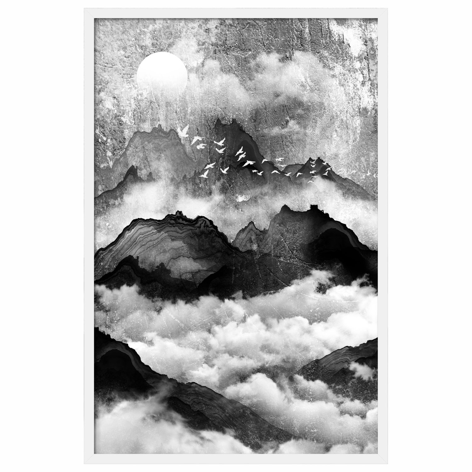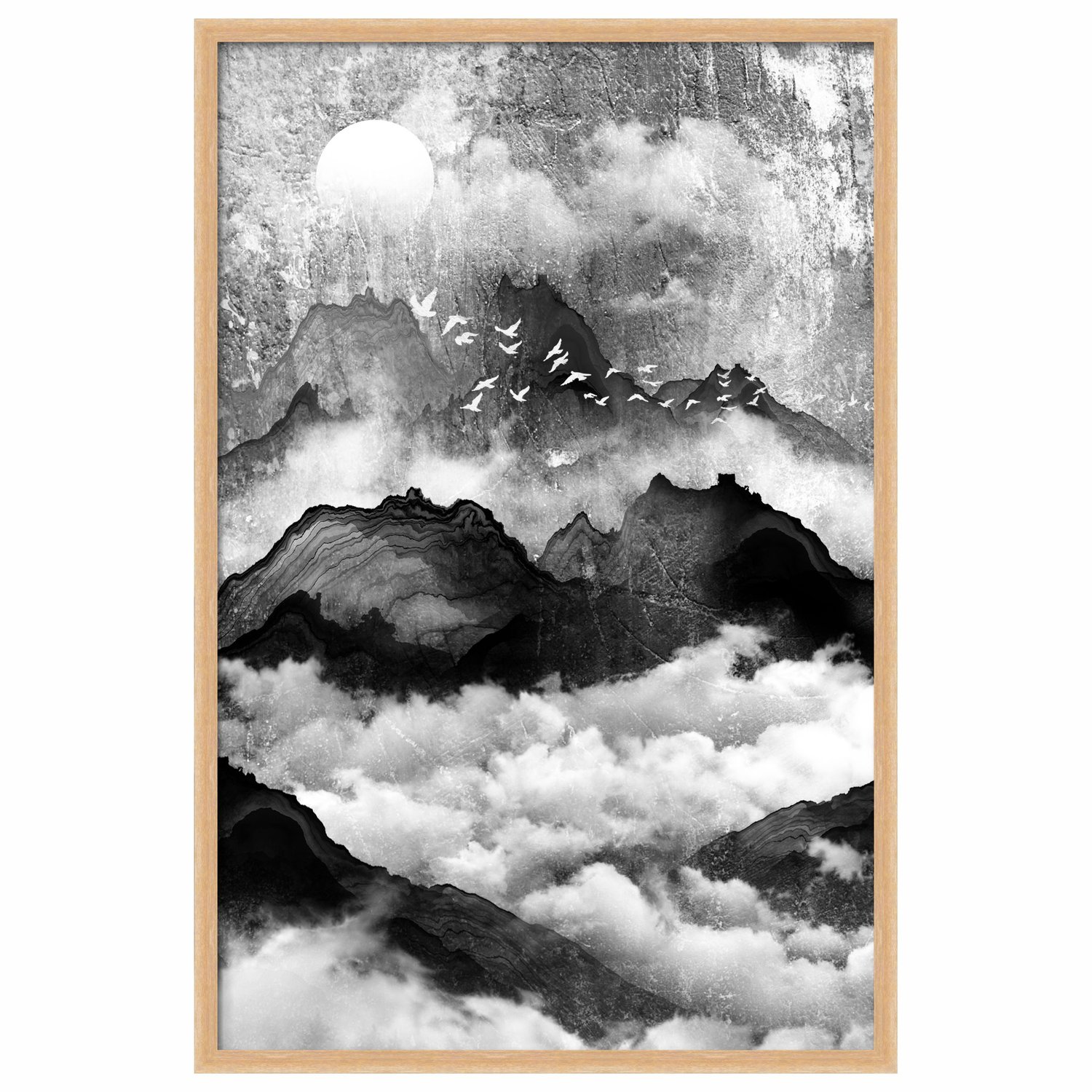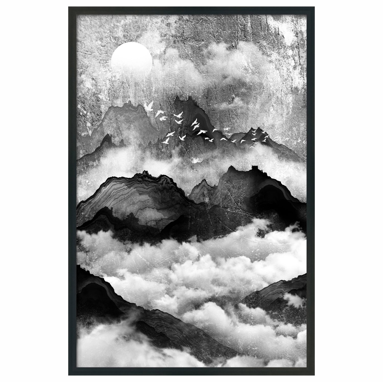 Quadro Decorativo Yama Tori Pintura de Montanhas e Pássaros no Estilo Sumiê
