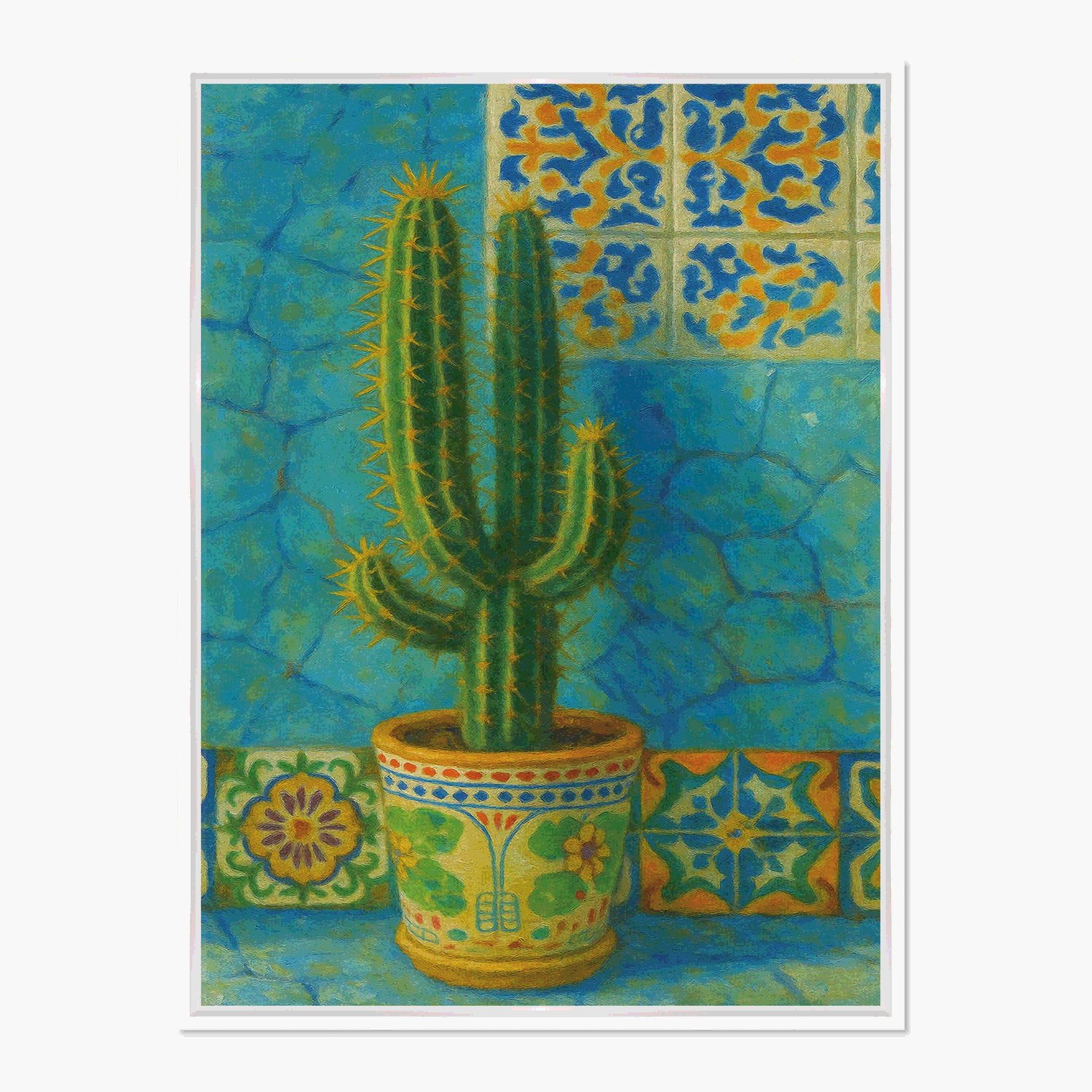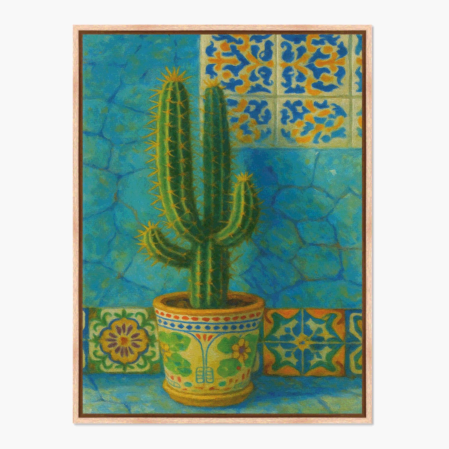 Quadro Em Tela Canvas Cacto Ornamental em Vaso Maiólica Contra Parede de Azulejos Azul-Turquesa