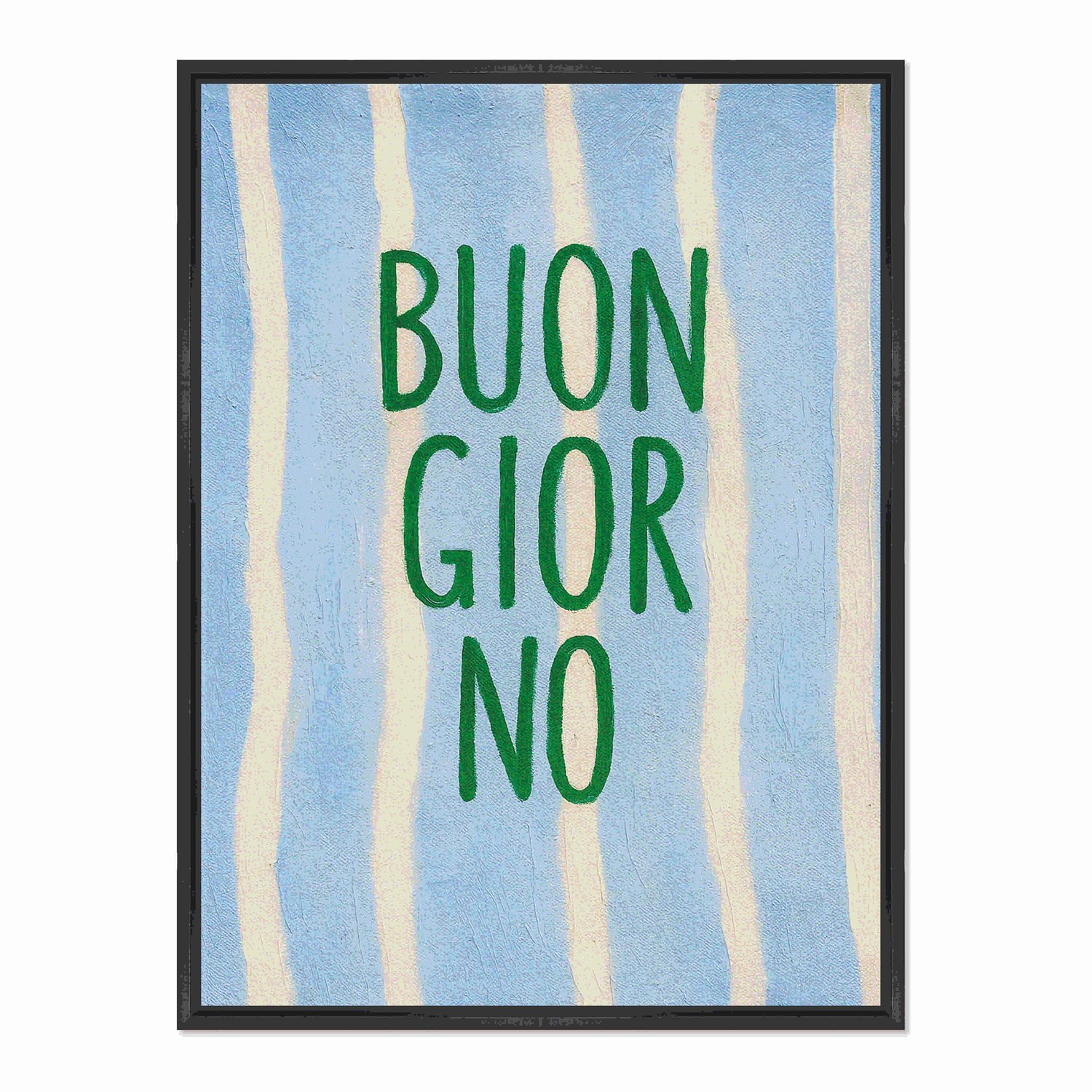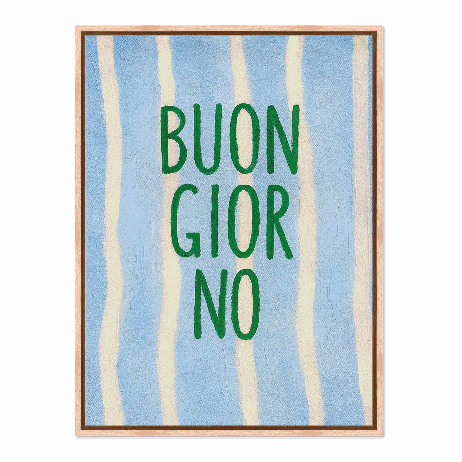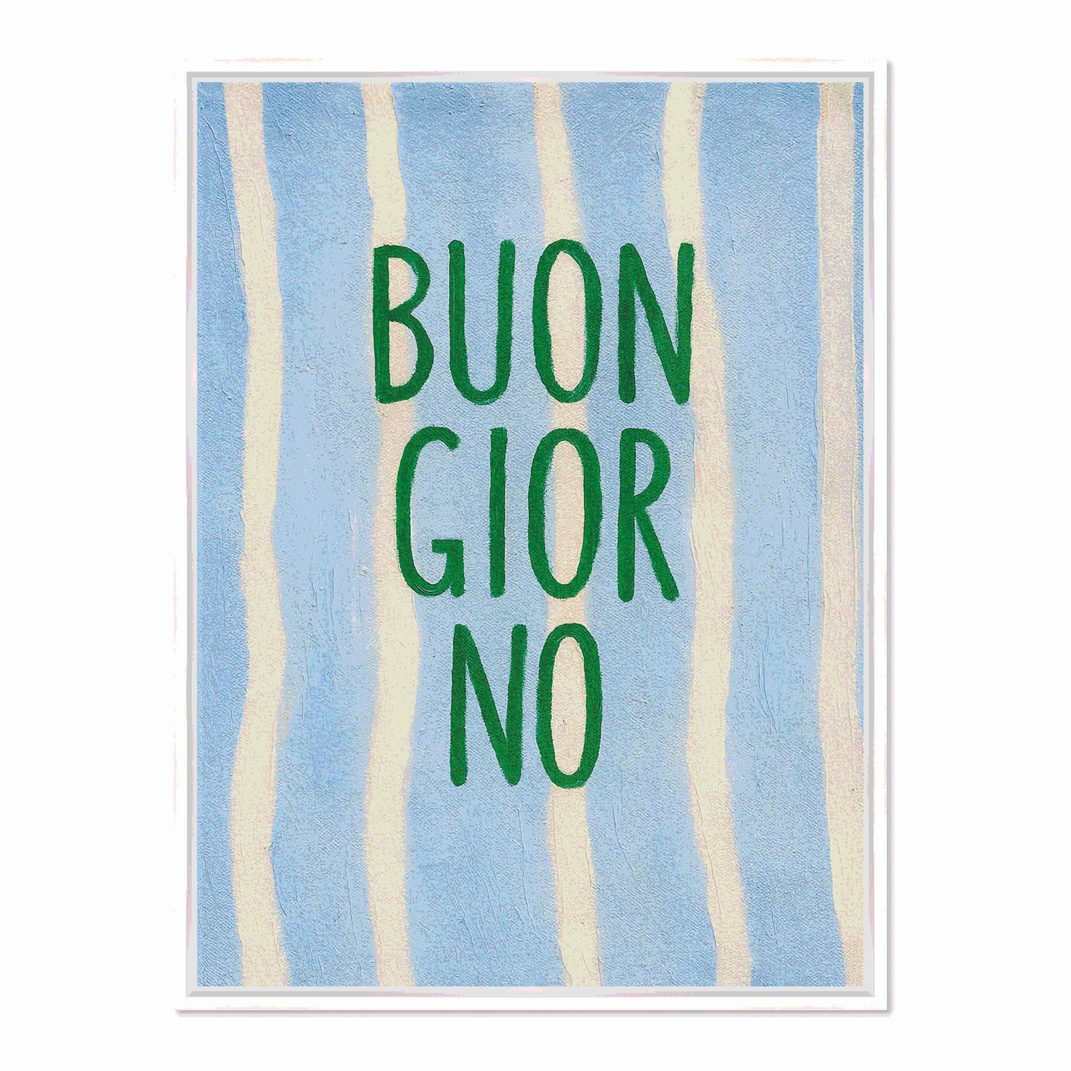 Quadro Em Tela Canvas Estilo Pintura Mid Century "Buon Giorno" em Verde, em Fundo de Padrão Listrado Azul Claro e Creme