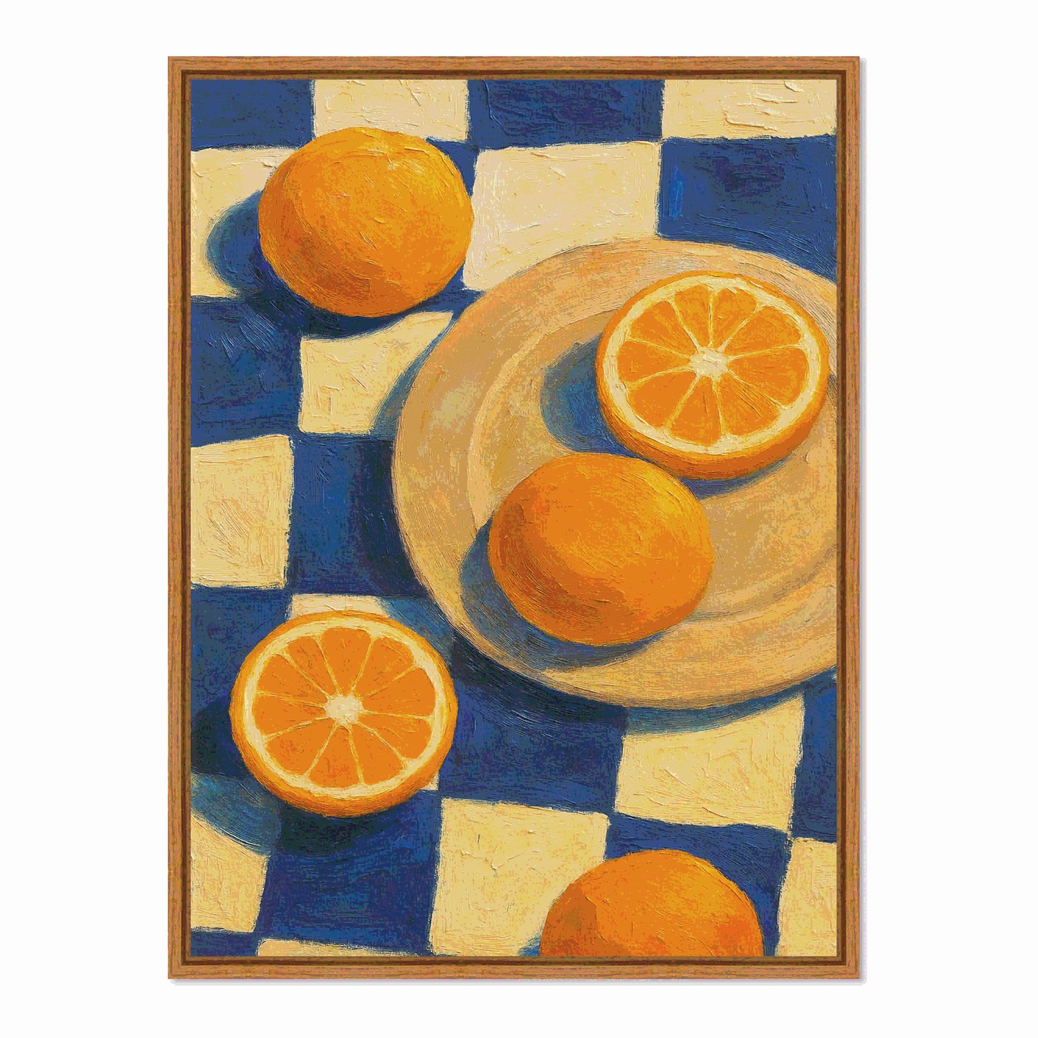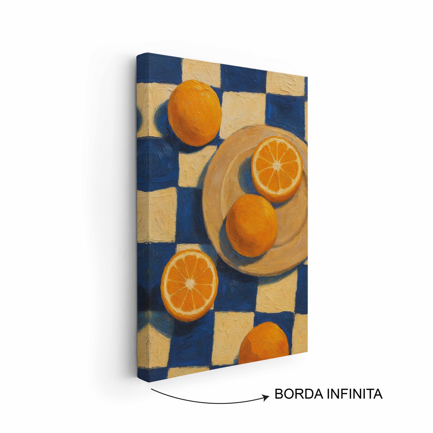 Quadro Em Tela Canvas Estilo Pintura Mid Century Composição de Laranjas no Prato e sobre o Fundo Xadrez Azul