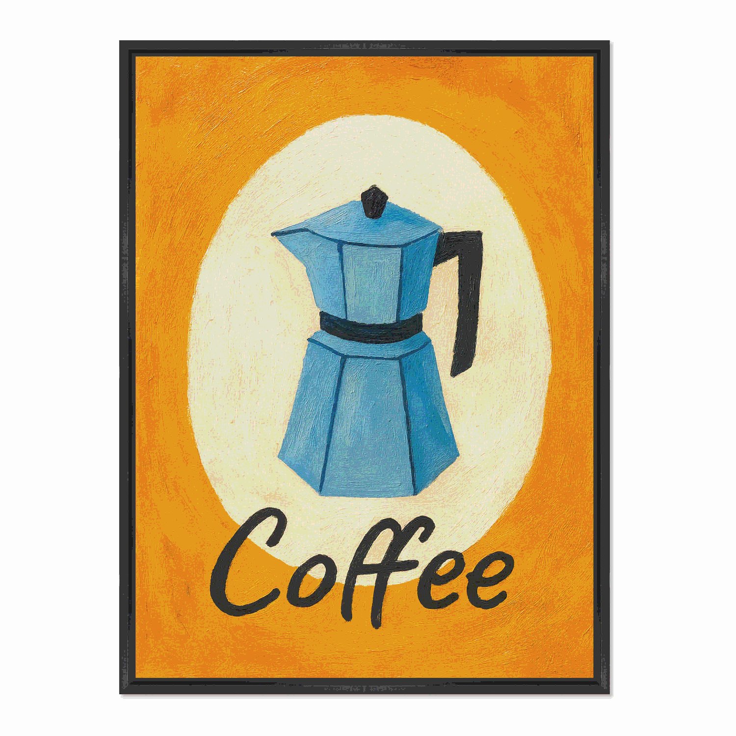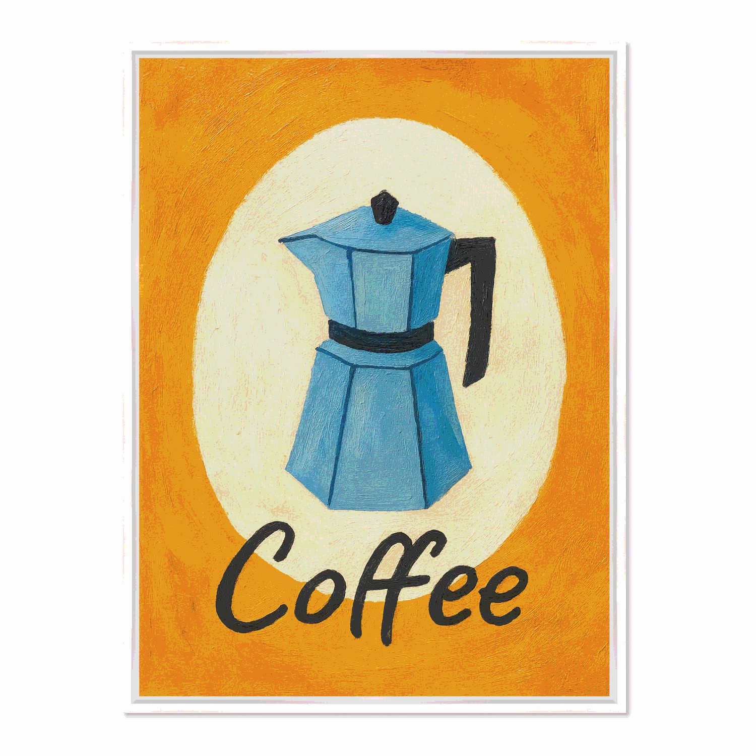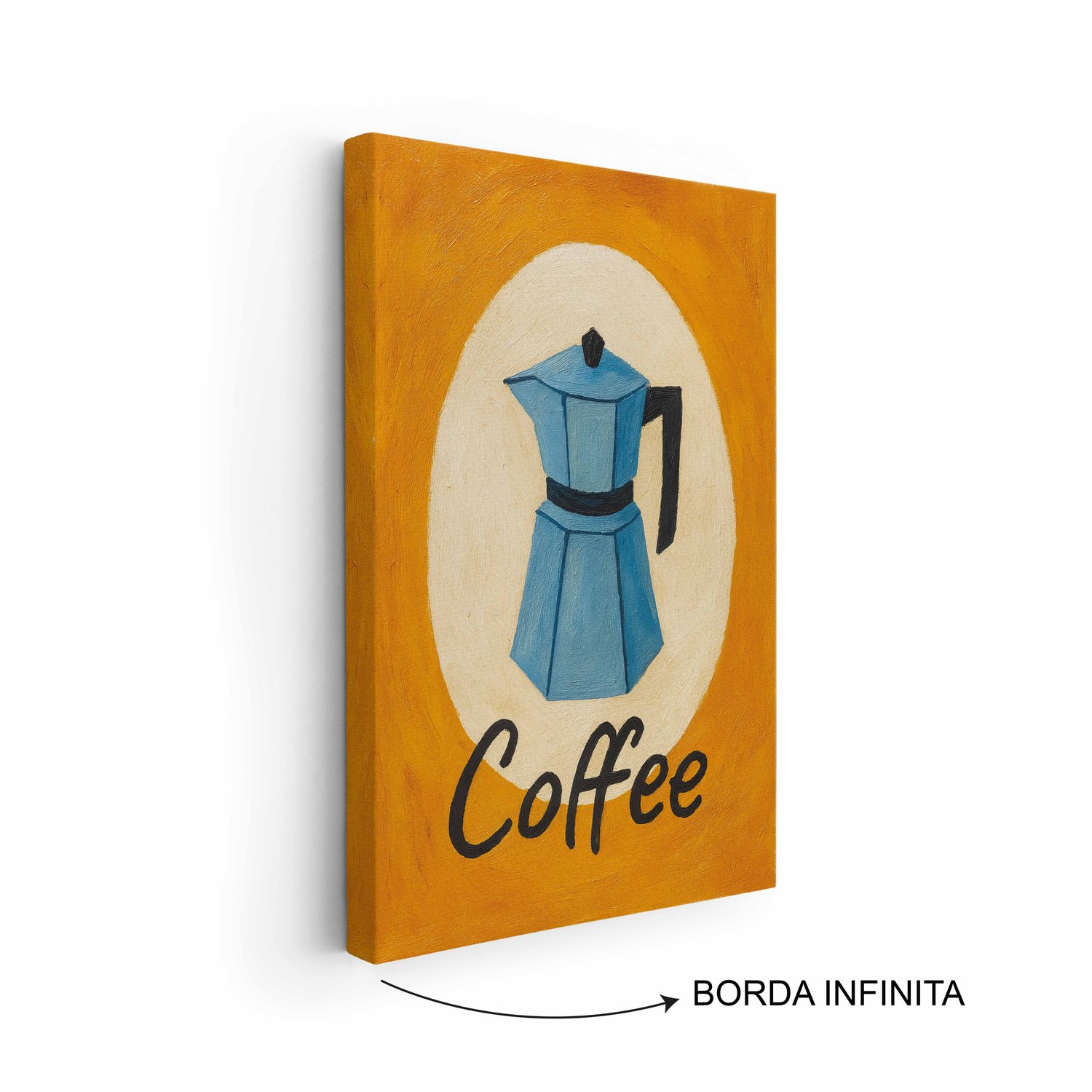 Quadro Em Tela Canvas Estilo Pintura Mid Century/Retrô Moka Italiana Azul em Círculo Creme com Fundo Laranja Vibrante