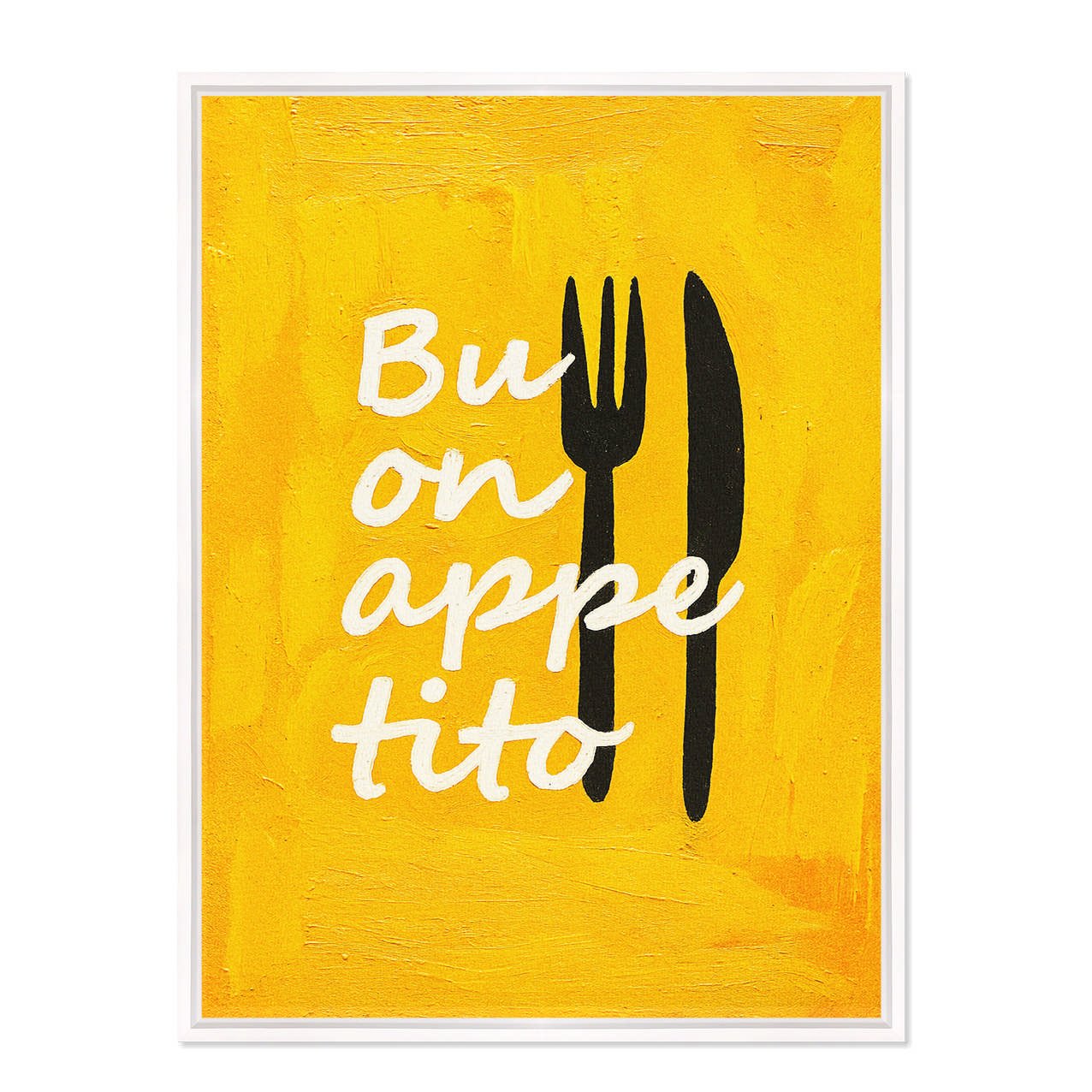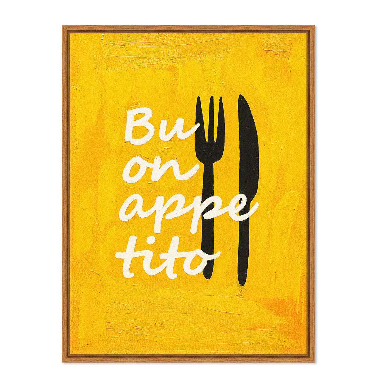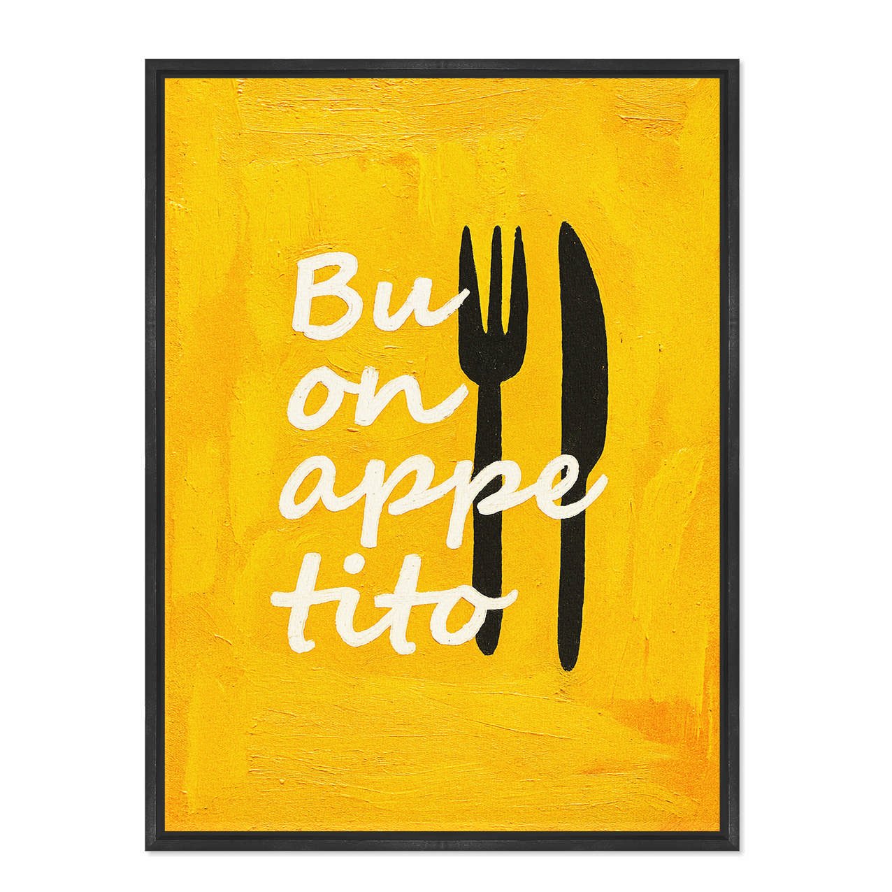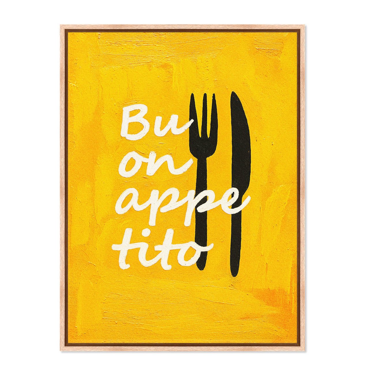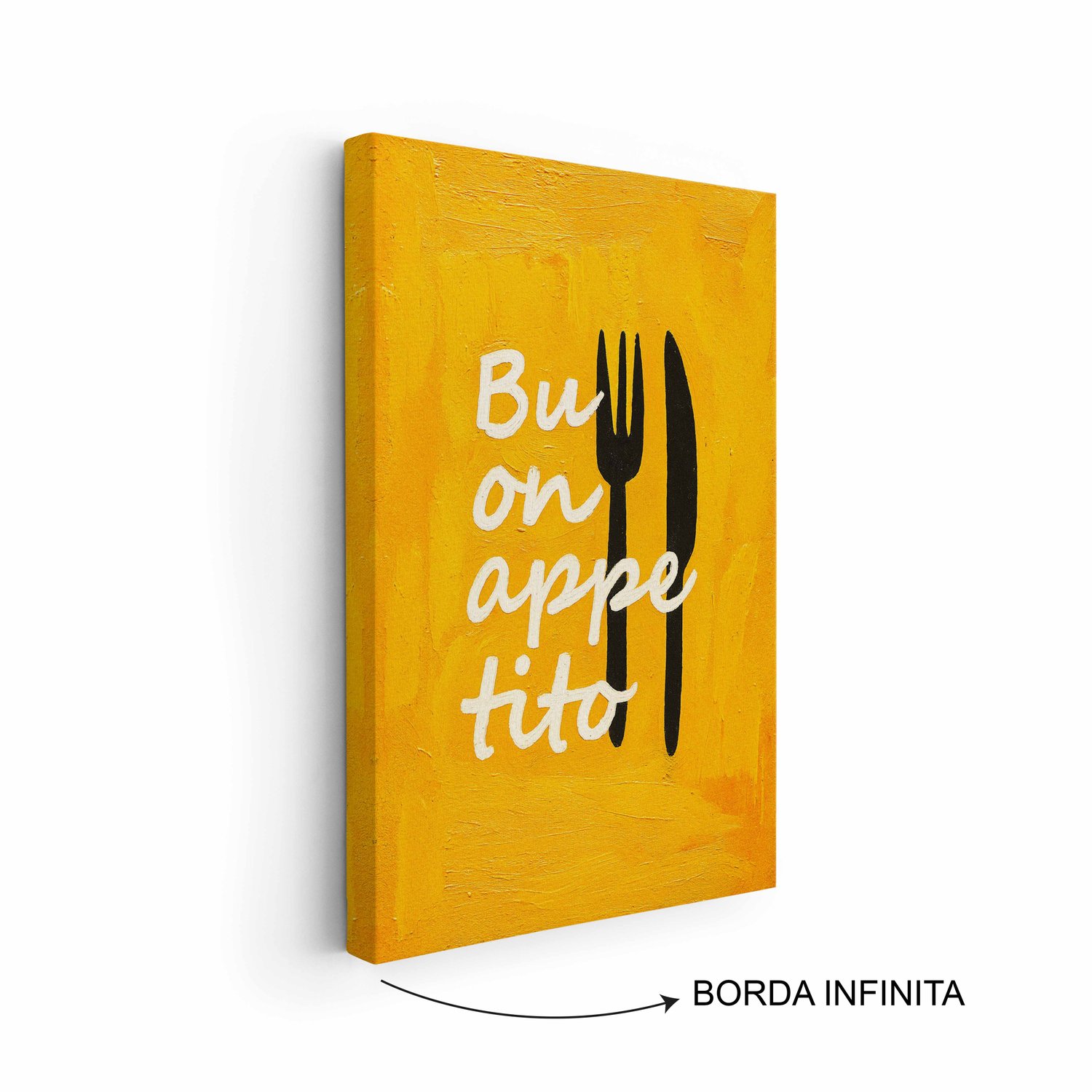 Quadro Em Tela Canvas Estilo Pintura Folk Moderno/Pop "Buon Appetito" sobre Fundo Amarelo, com Silhuetas de Talheres
