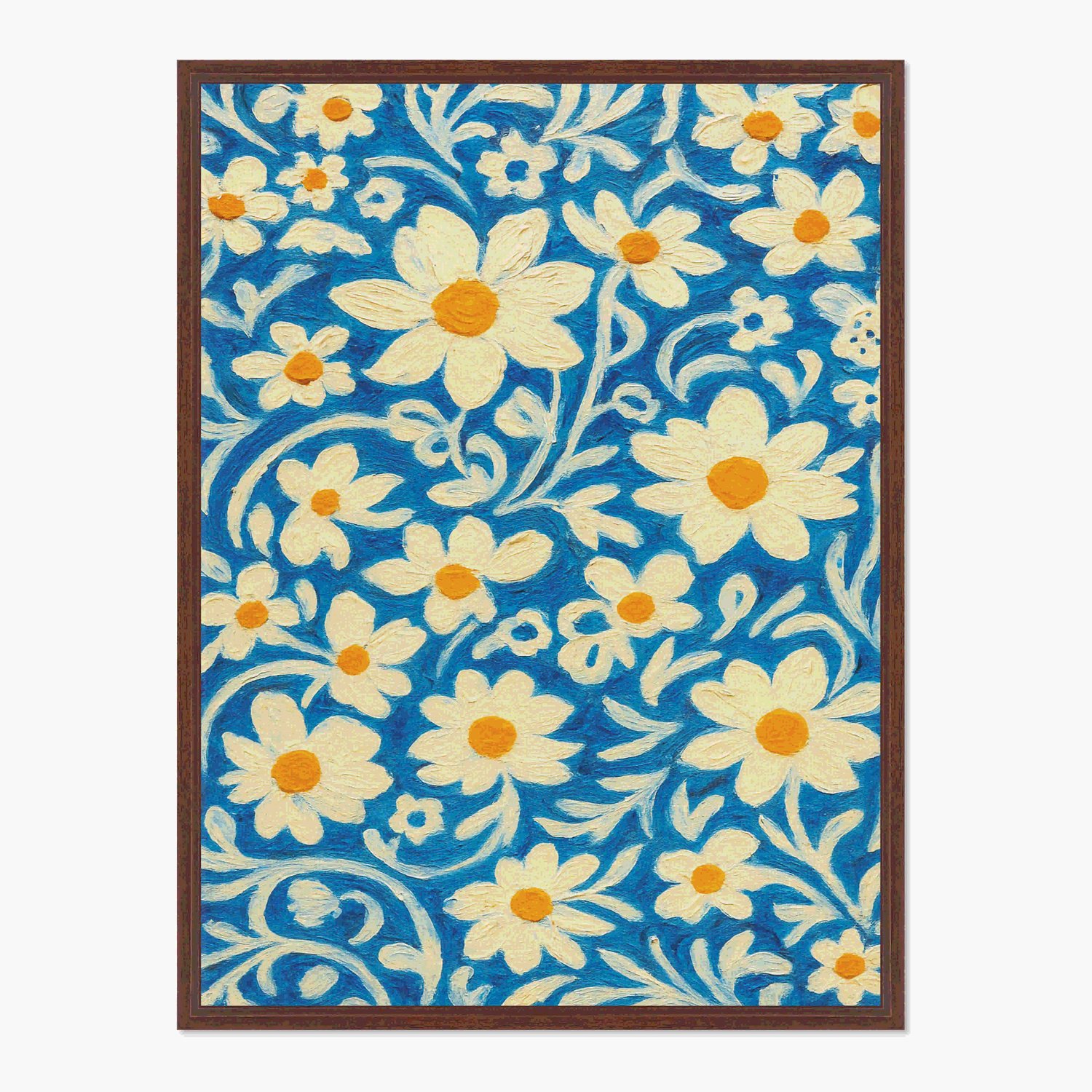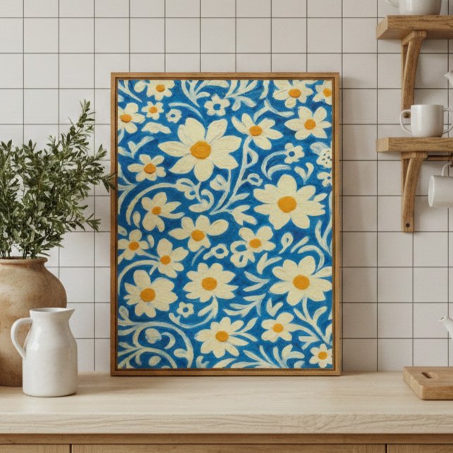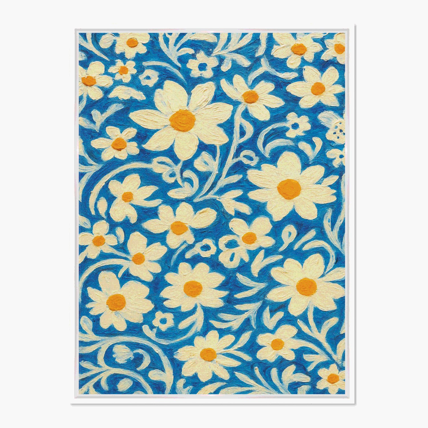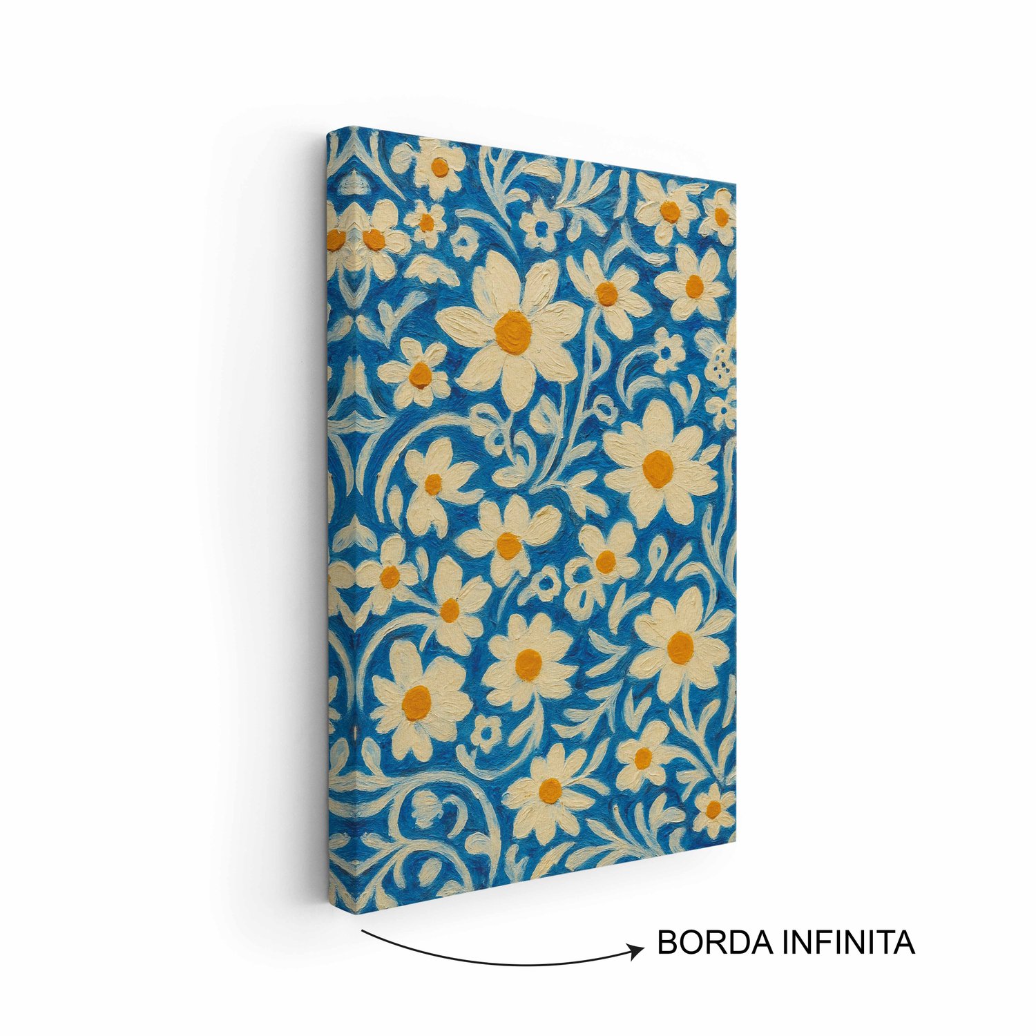 Quadro Em Tela Canvas Padrão Floral Estilizado: Margaridas Brancas e Amarelas em Fundo de Arabescos Azul-Cobalto