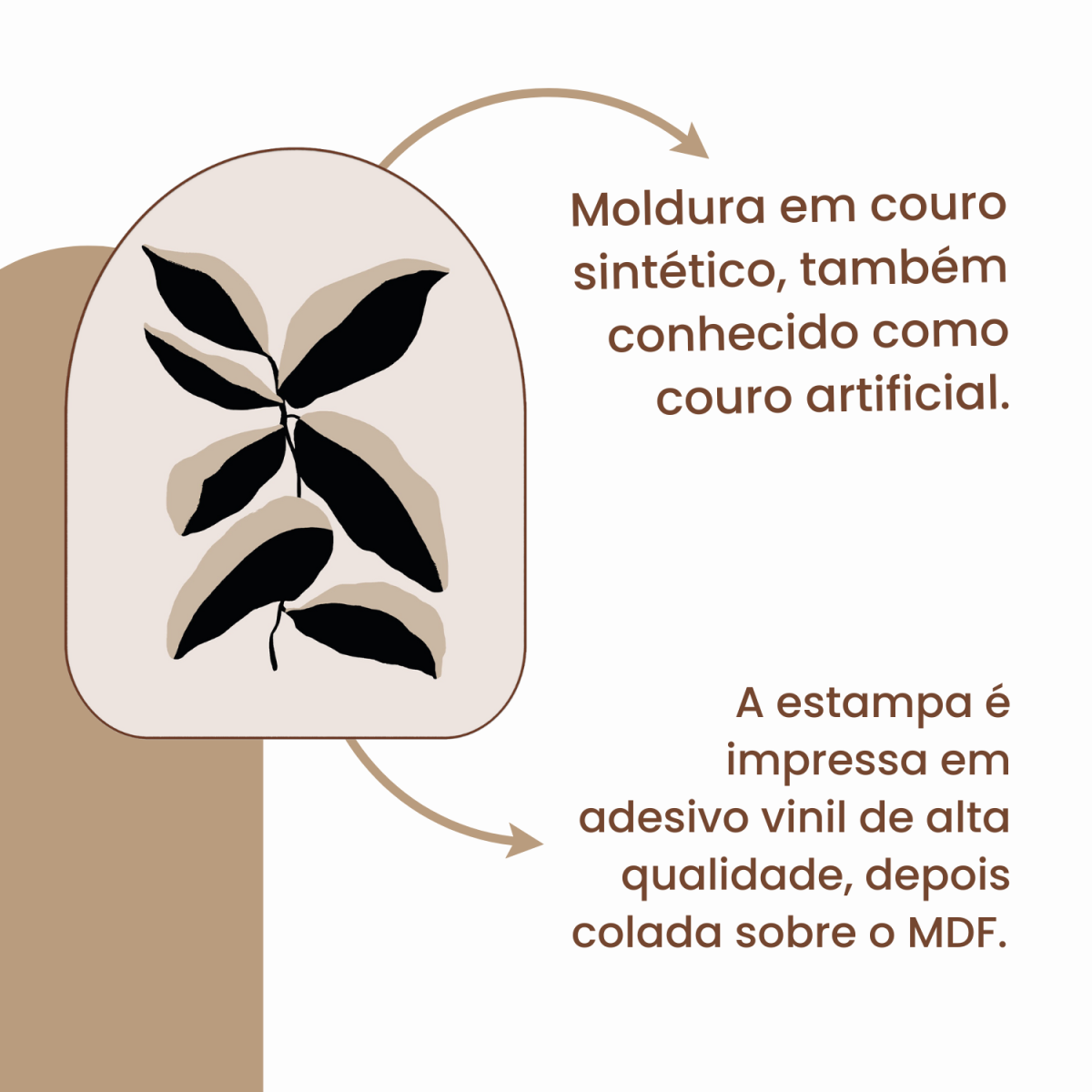 Moldura: Moldura em couro sintético, também conhecido como couro artificial, couro vegano ou couro falso, é um material que imita as características do couro natural, mas não é produzido a partir de materiais provenientes de animais, ou seja, é fabricado de diferentes materiais, como o poliuretano (PU) ou poliéster revestido com um composto de plástico, livre de produtos de origem animal!