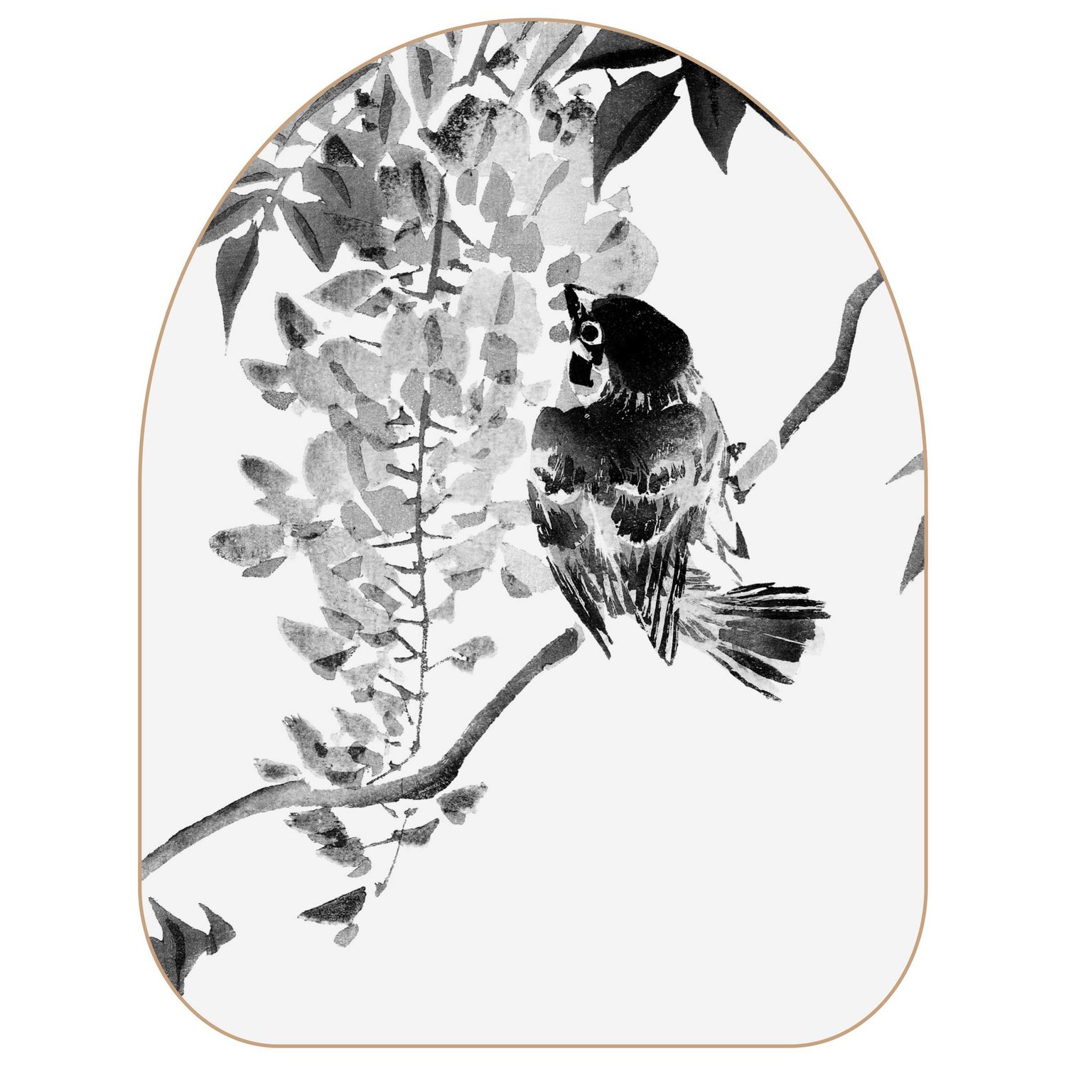 Quadro Orgânico Decorativo Suzume Pintura de Pardal em Meio às Flores no Estilo Sumiê com Moldura em Couro Sintético