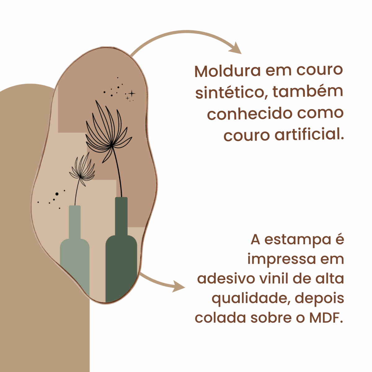 Moldura: Moldura em couro sintético, também conhecido como couro artificial, couro vegano ou couro falso, é um material que imita as características do couro natural, mas não é produzido a partir de materiais provenientes de animais, ou seja, é fabricado de diferentes materiais, como o poliuretano (PU) ou poliéster revestido com um composto de plástico, livre de produtos de origem animal!
