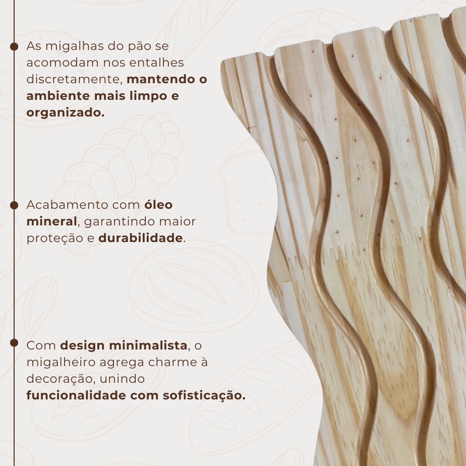 Este migalheiro é feito em pinus natural e finalizado com óleo mineral atóxico para proteger a madeira. Com um formato fluido e frisos delicados, a peça foi pensada para capturar migalhas de forma eficiente e discreta, mantendo a bancada sempre limpa.