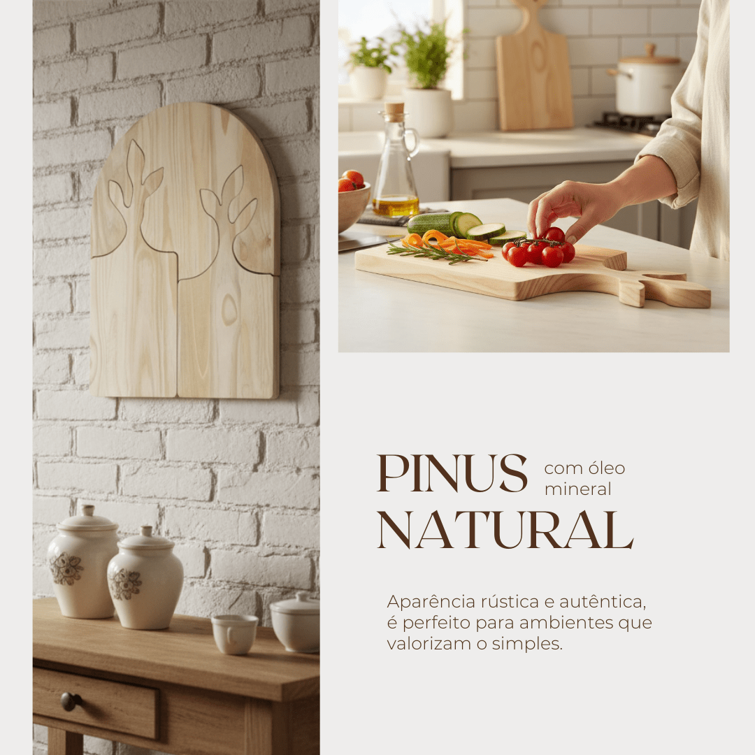 Feita em madeira pinus de reflorestamento, esta tábua combina beleza natural, durabilidade e design exclusivo.